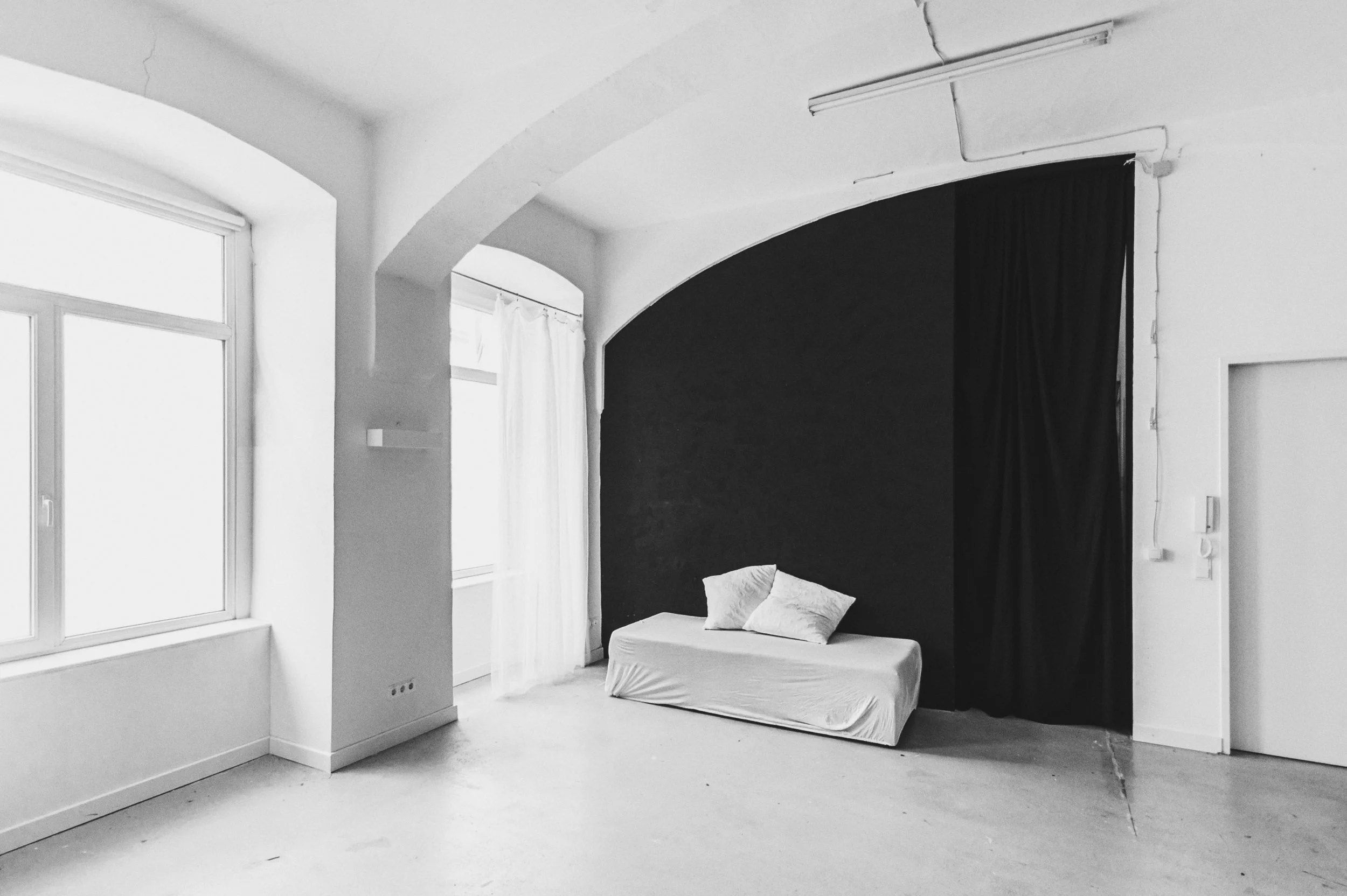Eine schwarze Wand mit feiner Struktur bietet einen starken Kontrast zur White Corner.